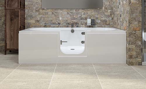 A walk-in bath is a special bathtub with a low-entry door that lets you get in and out of the bath safely without climbing over the side. It also has a built-in seat. Walk-in baths are especially popular with elderly people and people with limited mobility.